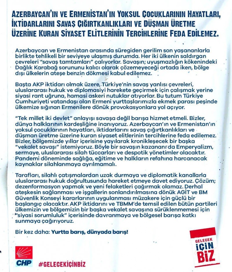 CHP’li Canan Kaftancıoğlu’nun “siyasi mentoru” İlhan Cihaner’in “Gelecek İçin Biz” grubu tarafından hazırlanan bildiride Kardeş Azerbaycan'a destek verenler "Başta AK Parti iktidarı olmak üzere Türkiye'nin savaş yanlısı çevreleri" olarak gösterilerek "Her iki ülkenin saldırgan çevreleri 'Savaş tamtamları' çalıyorlar. Savaşın; uyuşmazlığın kökenindeki Dağlık Karabağ sorunu kalıcı olarak çözemeyeceği ortada iken, bölge dışı ülkelerin benzin dökmesi kabul edilemez." denildi.