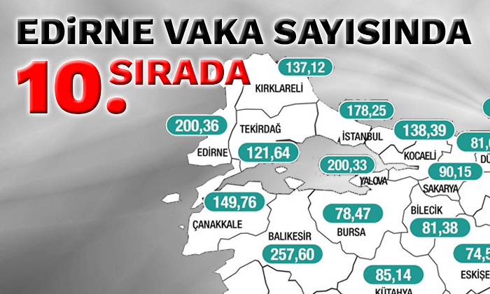 Sağlık Bakanı Fahrettin Koca, il bazında 7 günlük Covid-19 vaka sayılarını gösteren haritayı sosyal medya hesabından yayınladı. 6-12 Mart haftasında, bir önceki haftaya göre 58 ilde vaka sayısında artış yaşandı. Samsun, Sinop, Giresun, Balıkesir, Kilis, Ordu, Tokat, Trabzon ve Konya’nın ardından Edirne, 100 bin kişide en fazla vakanın görüldüğü il oldu. Açıklanan verilere göre, Edirne’yle birlikte toplam 11 il vaka sayısında 200 barajını aştı.
