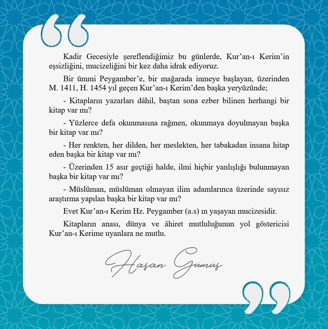 Kadir Gecesiyle şereflendiğimiz bu günlerde, Kur’an-ı Kerim’in eşsizliğini, mucizeliğini bir kez daha idrak ediyoruz.