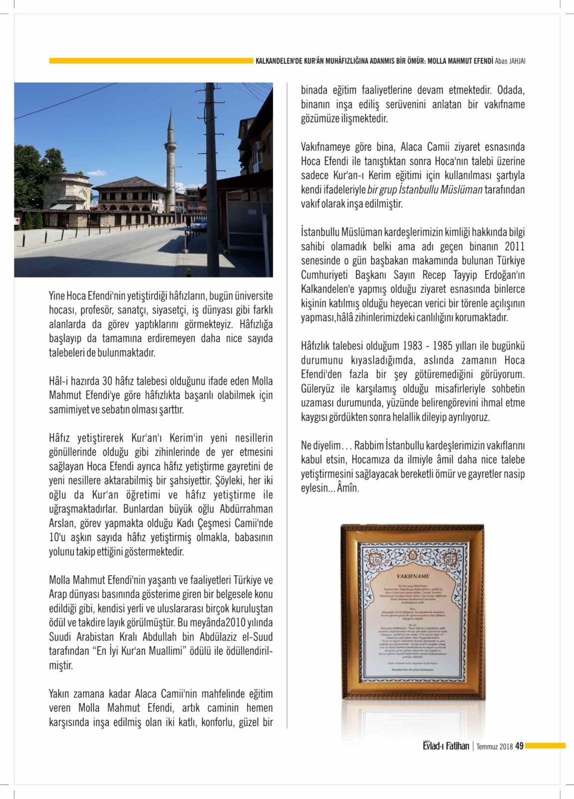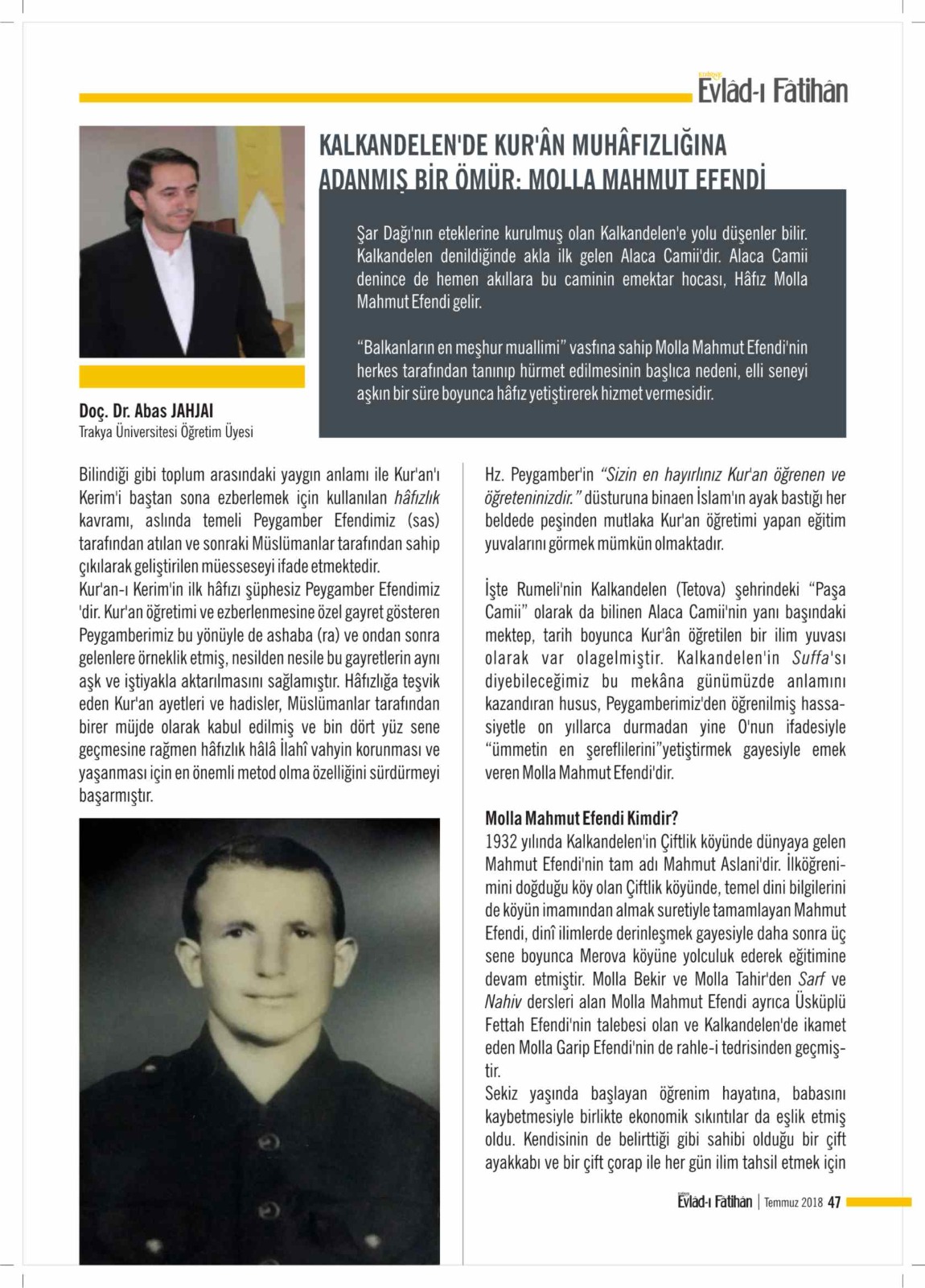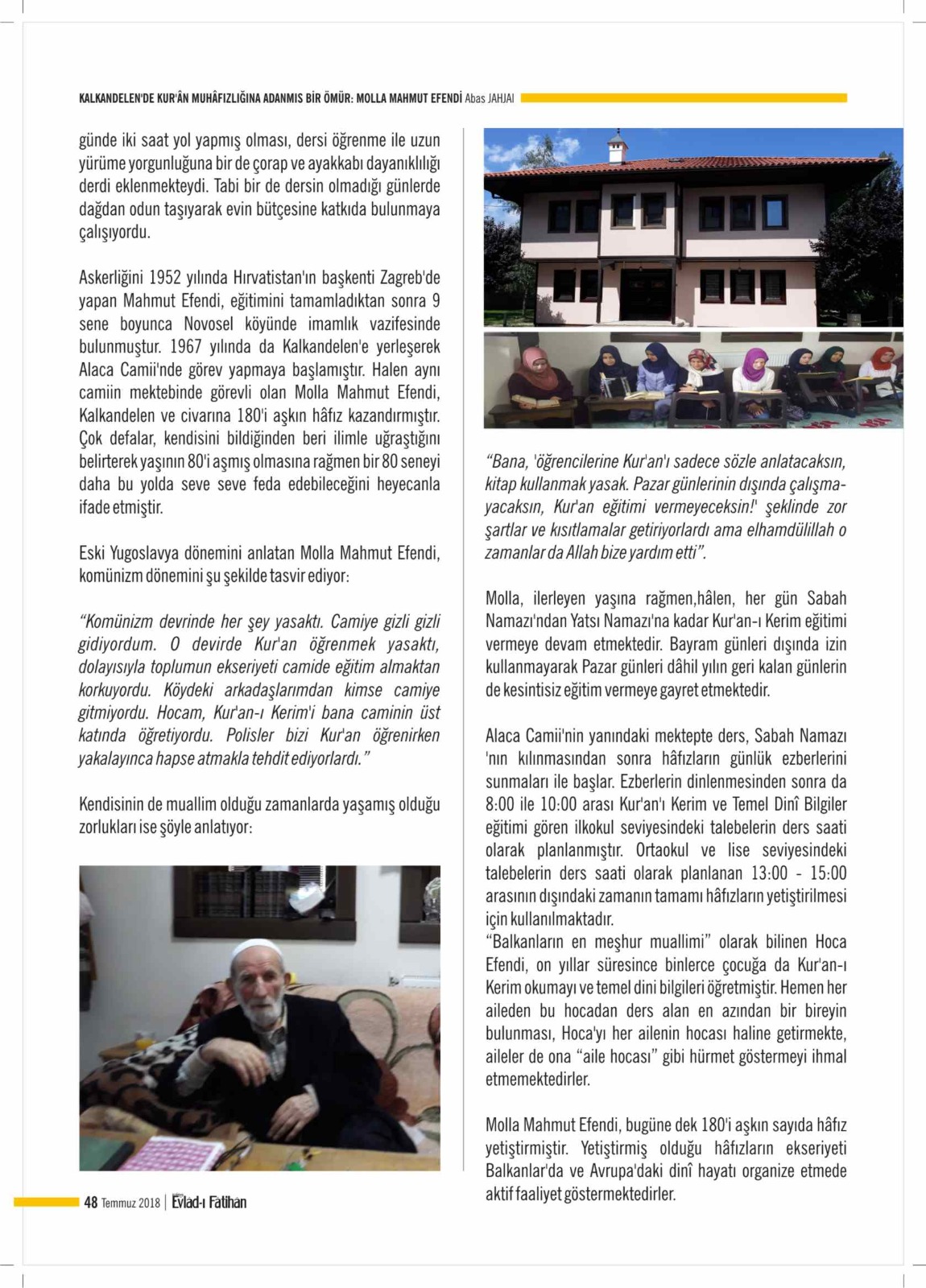 Makedonya Kalkandelen Alaca Câmii'nde, dönemin zor şartlarına rağmen onlarca hâfız, yüzlerce Kur'ân talebesi yetiştiren Molla Mahmud Efendinin hayatını kaybettiğini derin bir üzüntü ile öğrenmiş bulunuyoruz. Evlâd-ı Fâtihân Dergimizdeki yazı, belki de merhûm hakkında yayımlanan son yazı idi. Evladı Fatihan Dergisi Yönetimi olarak Evlatları, talebeleri sayesinde amel defteri kapanmayacak olan büyüğümüze Merhum Molla Mahmud Efendi ye Allah'tan rahmet ve mağfiret sevenleri ne başsağlığı dileriz."