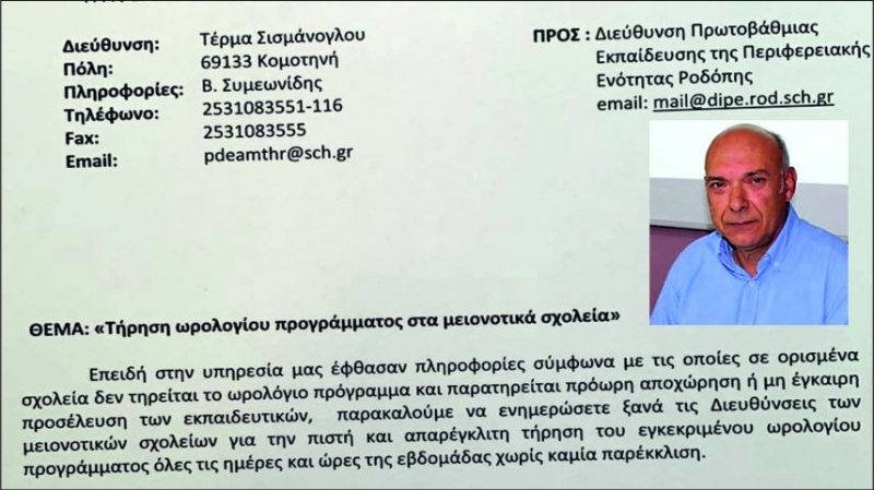 Doğu Makedonya Trakya Eğitim Müdürü Kostandinos Bandikos, Rodop İli Birinci Derece İl Eğitim Müdürlüğüne gönderdiği yeni yazıyla azınlık ilkokullarının Cuma günü erken paydos yapmasını yasaklayarak azınlık öğrencilerinin Cuma namazına gitmesine engel koydu.