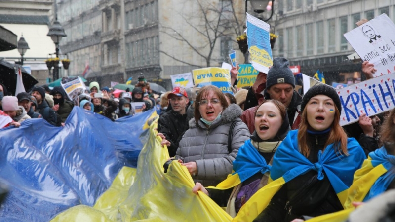 Başkent Belgrad'da bir araya gelen yüzlerce gösterici, "Ukrayna'da barış", "Yaşasın Ukrayna" ve "Savaşı durdurun" sloganları attı.