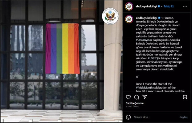 ABD Büyükelçiliği Ankara’da yeni yapılan büyükelçilik binasına LGBT bayrağı astı. Skandalı sosyal medya hesaplarından yaptıkları paylaşımla açıklayan ABD Büyükelçiliği, aile ve toplum ahlakını hedef alan LGBTİ sapkınlığına sahip çıktı.