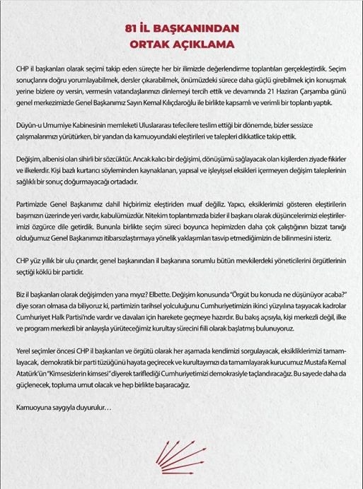 CHP Genel Başkanı Kemal Kılıçdaroğlu, seçim sonrası parti örgütleriyle ilk toplantısını yaptı. Ağırlıklı şikayet konusu, milletvekili listeleri ve İttifak partilerine verilen milletvekillikleri oldu. Toplantının ardından 81 il başkanı ortak bildiri yayınladı.