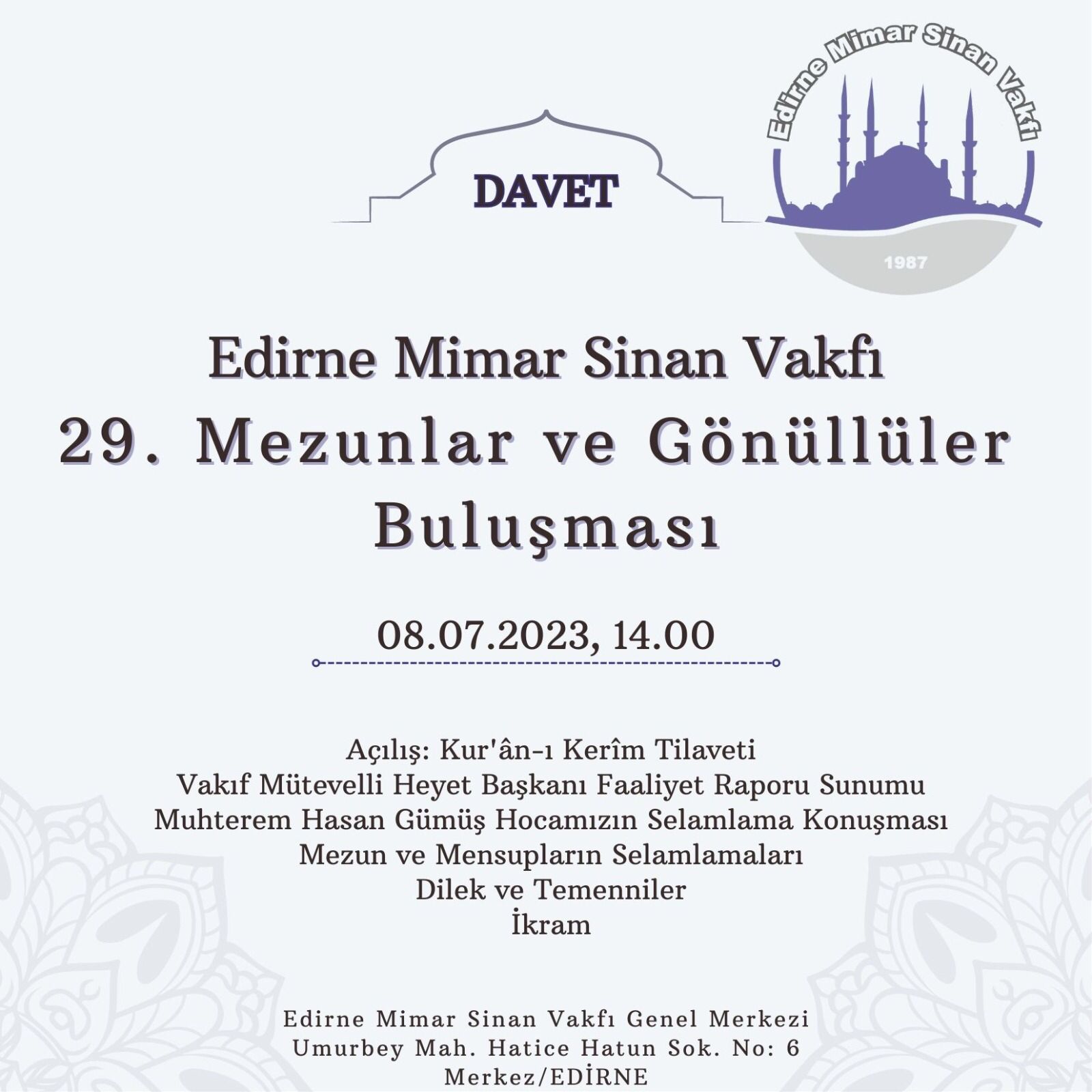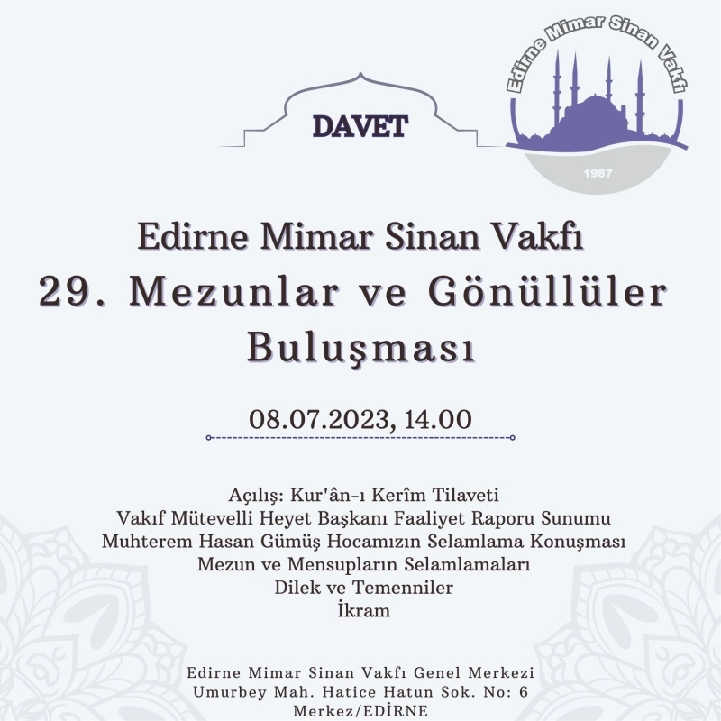 Mimar Sinan Vakf'ından yapılan yazılı açıklamada; Her yıl Temmuz ayının ilk Cumartesi günü gerçekleştirilen, Vakfın Geleneksel ''Mezunlar ve Gönüllüler Buluşması'' bu yıl da 08 Temmuz 2023 Cumartesi günü Vakıf merkezinde yapılacağı bildirildi.