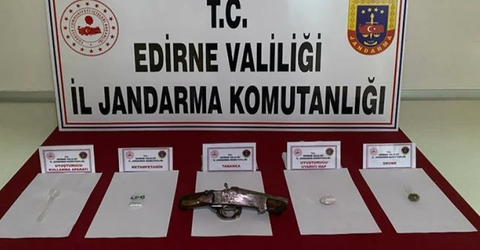 Edirne İl Jandarma Komutanlığı kaçakçılık olaylarının engellenmesine yönelik yaptığı kontrollerde uyuşturucu madde ile 1 adet ruhsatsız tabanca ele geçirdi.