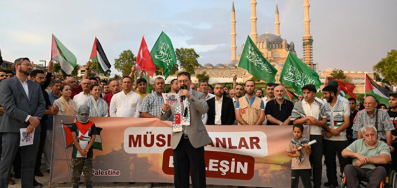 Edirne'de Selimiye Meydanı'nda düzenlenen "Şehitlere rahmet, zalimlere lanet" isimli programa katılanlar ellerinde Türk ve Filistin bayrakları taşıdı, "Müslümanlar birleşsin" yazılı pankart açtı.