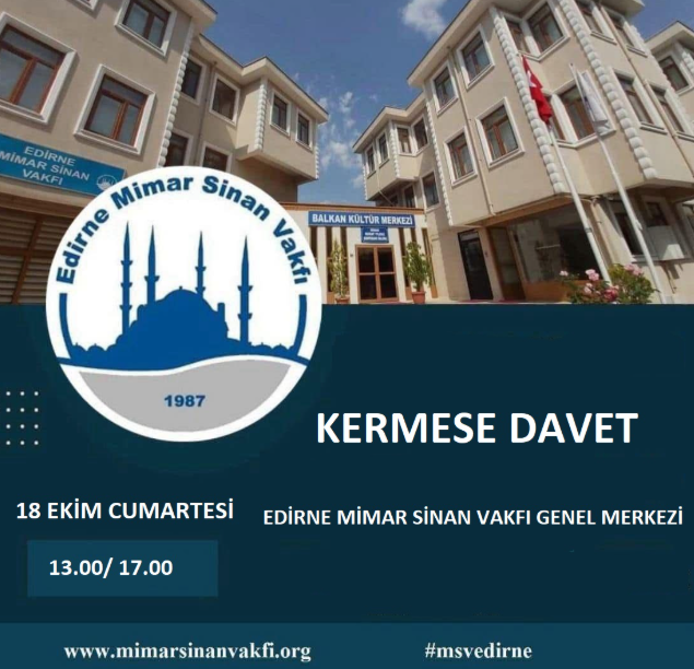 Edirne Mimar Sinan Vakfı ; Edirne'nin kültürel hayatına büyük katkılar sağlayan, düzenli olarak kültürel çalışmalar (konferanslar, paneller, açık oturumlar, toplantılar) gerçekleştiren, 1987 yılında kurulan vakıf, her yıl yüksek öğrenim öğrencilerine burs desteği ve ihtiyaç sahibi ailelere gıda-yakacak yardımlarında bulunan ve bir çok etkinliğe öncülük eden Mimar Sinan Vakfının organize ettiği kermes 18 Ekim Cumartesi günü, Selimiye Camii yanında bulunan "Mimar Sinan Vakfı Balkan Kültür Merkezi'nde gerçekleştirilecek.