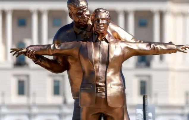 Washington’daki heykel de bu sahneyi taklit ediyor. Altın renginde hazırlanan büyük heykelde Epstein kollarını iki yana açmış halde dururken Trump’ın onu arkadan tuttuğu görülüyor.