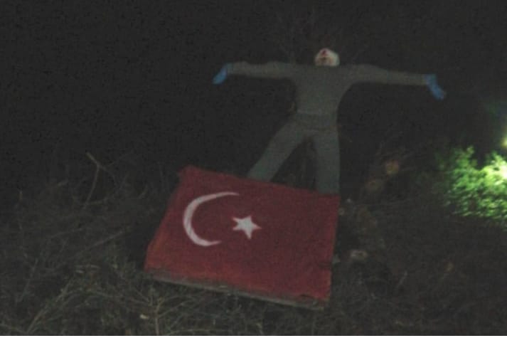 Asılı mankenin üzerinde Yunan alfabesi ile ERDOĞAN yazılmış.
