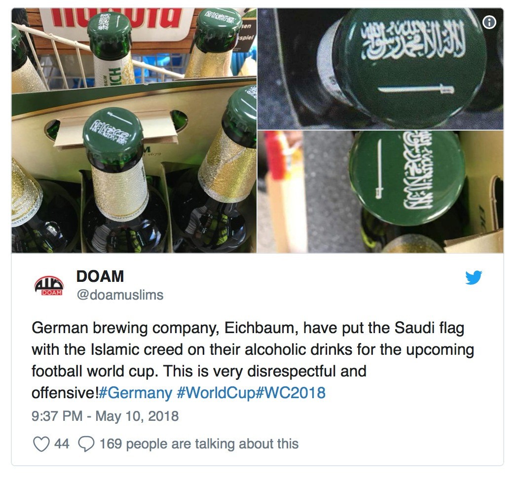 Firmanın, bu konsept kapsamında Suudi Arabistan bayrağını da bira şişesinin kapağına monte ettiği, ancak Suudi bayrağında Kelime-i Tevhid yazısının dikkate alınmadığı belirtildi.