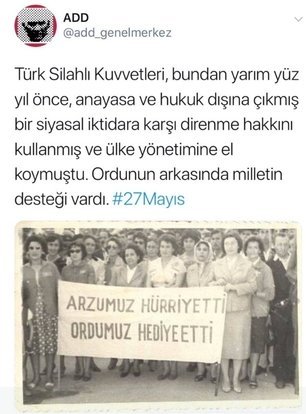 Atatürkçü Düşünce Derneği’nin sosyal medya hesabından, "Türk Silahlı Kuvvetleri, bundan yarım yüz yıl önce, anayasa ve hukuk dışına çıkmış bir siyasal iktidara karşı direnme hakkını kullanmış ve ülke yönetimine el koymuştu. Ordunun arkasında milletin desteği vardı. #27Mayıs’’ şeklinde yaptığı paylaşımın sorulması üzerine Soylu, konuyu araştırdıklarını, söz konusu paylaşımla ilgili hemen Bakanlık olarak suç duyurusunda bulunacaklarını ve soruşturma başlatacaklarını söyledi.