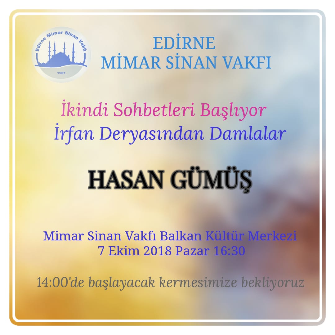 Edirne Mimar Sinan Vakfı İkindi Sohbetleri "İrfan Deryasından Damlalar" Hasan Gümüş hocanın sohbeti ile 7 Ekim Pazar günü Selimiye Camii yanında bulunan Mimar Sinan Vakfı Balkan Kültür Merkezi’nde başlıyor,