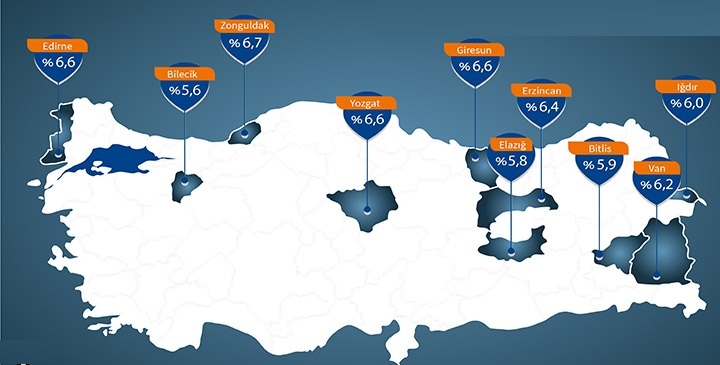Erzincan Merkez ilçesi yüzde 6,4 ile 21. sırada yer alırken, onu sırasıyla yüzde 6,3 ile İzmir Güzelbahçe ve Balıkesir Karesi, yüzde 6,2 ile Van İpekyolu, yüzde 6,1 ile İzmir Bergama, yüzde 6 ile Iğdır Merkez, İzmir Çeşme, Aydın Didim ve Muğla Marmaris, yüzde 5,9 ile Samsun İlkadım, Bitlis Merkez ve İzmir Urla takip ediyor.