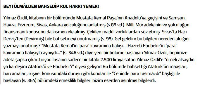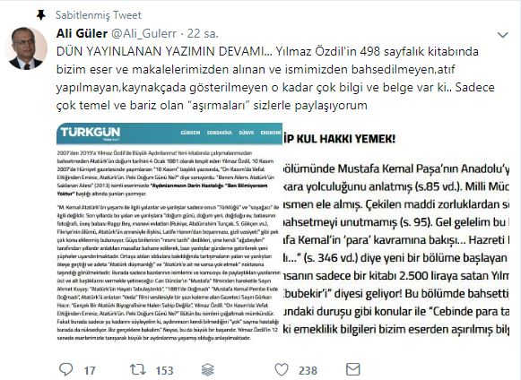 Güler, sosyal medya hesabından yaptığı paylaşılarla kitabın pek çok yerinde çok bariz aşırmalar olduğunu söyledi.Güler, Yılmaz Özil'in "10 yıl çalıştım" dediği Mustafa Kemal kitabını "498 sayfalık kitabında bizim eser ve makalelerimizden alınan ve ismimizden bahsedilmeyen,atıf yapılmayan,kaynakçada gösterilmeyen o kadar çok bilgi ve belge var ki.. Sadece çok temel ve bariz olan “aşırmaları” sizlerle paylaşıyorum" diyerek örnekler verdi.