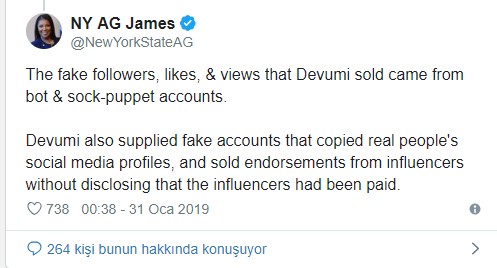 Daha önce, New York başsavcısı Letitia James tarafından “Yalan söyleyerek, kolay yoldan para kazanan Devumi şirketini işletenleri bulacak ve durduracağız” şeklinde yapılan açıklamanın ardından, bugün bir başka duyuru daha geldi.