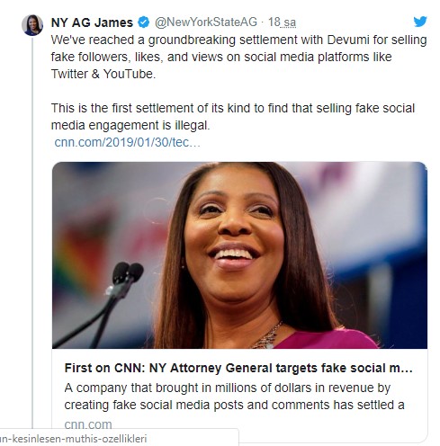 Başsavcı Letitia James, Twitter üzerinden yapmış olduğu yeni açıklama ile, Devumi adlı şirketi yöneten kişilerin yakalandığı ve sahte hesaplarla verilen hizmetlerin, artık illegal olduğunu açıkladı.