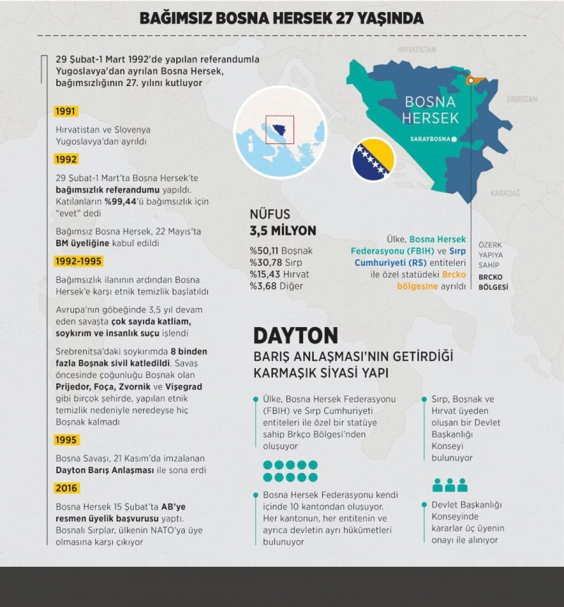 Yugoslavya'nın parçalanmaya başlamasının ardından 29 Şubat-1 Mart 1992'de yapılan referandumla bağımsızlığına kavuşan Bosna Hersek, bağımsızlığının 27. yılını kutluyor.