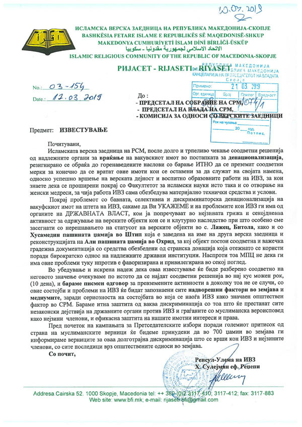 Başbakanlığa gönderilen İslam Birliği Başkanı Süleyman Recepi imzalı yazıda, vakıf mallarının iadesi, İştip Hüsameddin Paşa ve Ohri Ali Paşa Camilerinin sorunlarının çözüme ulaştırılması talep edildi. Yazıda öte yandan İslam Birliği’nin ayrımcılığa maruz kaldığını, Makedon Ortodoks Kilisesine ise ayrıcalık tanındığı ileri sürüldü.