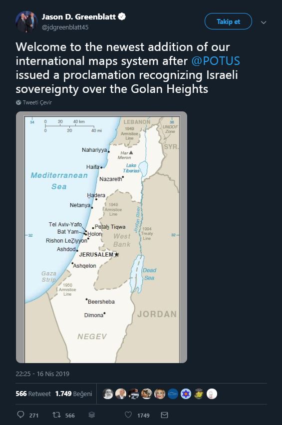 ABD Başkanı Trump’ın Uluslararası Müzakereler Özel Temsilcisi Jason D. Greenblatt, resmi sosyal medya hesabından paylaştığı işgal haritasıyla birlikte, “ABD Başkanı Trump’ın Golan Tepeleri’ni İsrail toprağı olarak tanımasının ardından uluslararası harita sistemimizin en yeni ilavesine hoş geldiniz.” satırlarını yazdı.