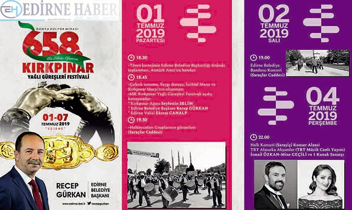 UNESCO İnsanlığın Somut Olmayan Kültürel Mirası Listesi’nde yer alan Kırkpınar’ın 658. randevusu 1 Temmuz Pazartesi günü başlıyor. Pazartesi günü 18.30’da Belediye önünde kortejin toplanmasının ardından açılış törenleri Atatürk Anıtı’nda devam edecek. Burada 658. Kırkpınar Ağası Seyfettin Selim, Belediye Başkanı Recep Gürkan ve Edirne Valisi Ekrem Canalp açılış konuşmalarını gerçekleştirecek. 19.30’da halk oyunları ekipleri Saraçlar Caddesi’nde kurulan sahnede gösterilerini sunacak.