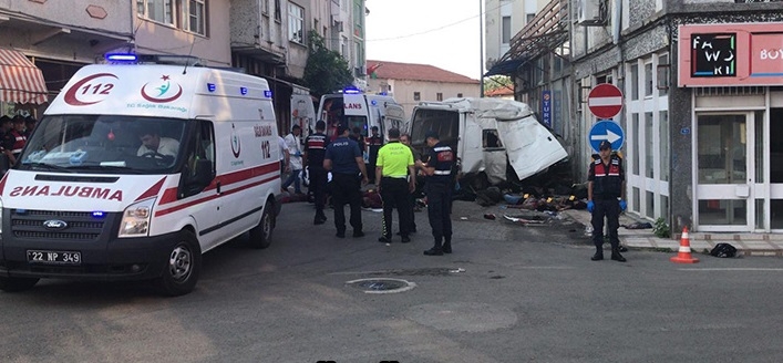 Açıklamada, "Meriç ilçemiz Büyük Doğanca Mahallesi'nde durumundan şüphelenilen bir araca jandarma komutanlığı ekiplerimizce dur ihtarında bulunulmuştur. Araç ihtara uymayıp hızla kaçmış, merkezde bulunan ana kavşakta yolunu alamayarak bir dükkana çarpmıştır. Kazada 10 göçmen vefat etmiş, 30 göçmen ise yaralanmıştır." bilgisi verildi.