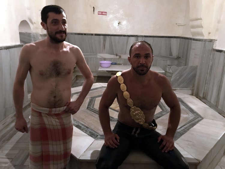 Babası Recep Gürbüz'ün de 1988 yılında başpehlivan olduğunda tercih ettiği Mezitbey Hamamı'na gelen Ali Gürbüz'ü sevenleri tezahüratlarla uğurladı.