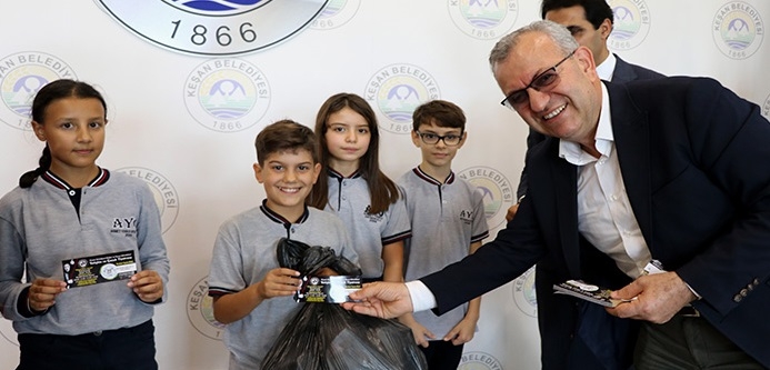 Çevre temizliğini amaçlayan proje kapsamında ilçedeki öğrenciler okul bahçesi ve çevresindeki pet şişeleri toplayıp Keşan Belediyesine getiriyor. Öğrenciler topladıkları pet şişeleri Belediye Başkanı Mustafa Helvacıoğlu'na vererek, tiyatro biletini alıyor.