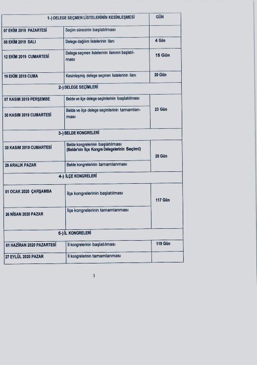 1Haziran 2020’de başlayacak il kongrelerinin ise 27 Eylül 2020’ye kadar tamamlanması planlanıyor. İl kongrelerinin tamamlanmasının ardından büyük kongre hazırlıkları başlayacak.