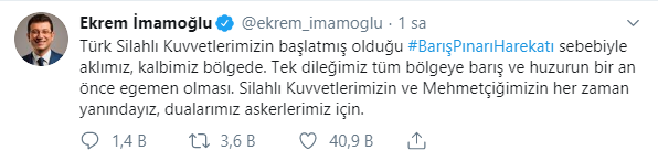 İstanbul Büyükşehir Belediye Başkanı Ekrem İmamoğlu, Barış Pınarı Harekatı'na ilişkin bir paylaşım yaptı.