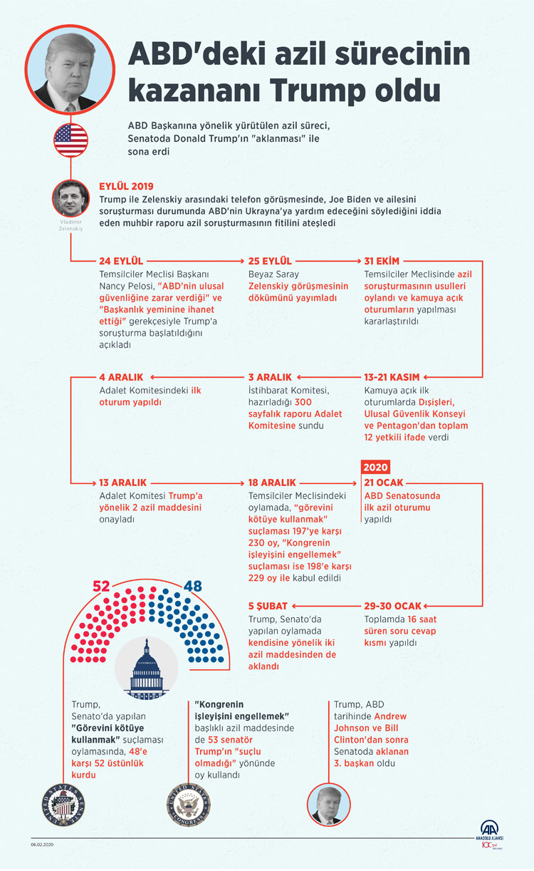 ABD'de Trump'a yönelik yürütülen, başkanın "görevin kötüye kullanılması" ve "Kongrenin işleyişini engelleme" maddelerinden yargılandığı azil süreci, Senato Genel Kurulunda dün yapılan oylama ile sona erdi.