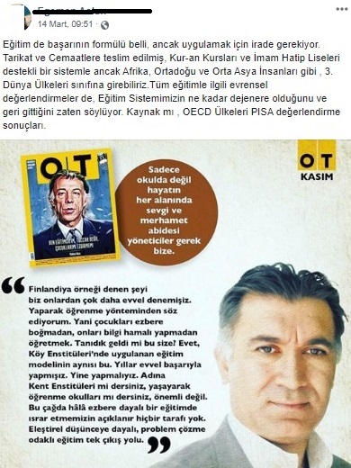 "Uzunköprü Ticaret Borsası Başkanı Egemen Aslan, göz bebeğimiz olan İmam Hatip Liselerimize ve Kur 'an Kurslarımıza hakaret ederek akılsız ve mantıksız eleştirilerde bulunmaktadır. Ülkemizin kötü yönetildiğini, bunun sebebinin ise hiçbir bilimsel veriye dayanmadan, İmam Hatip Liseleri ve Kur 'an Kursları olduğunu iddia etmektedir."