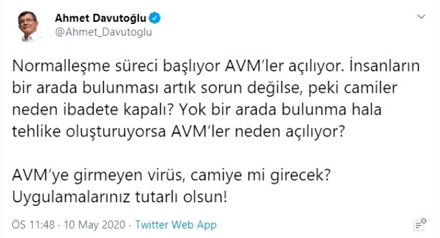 Davutoğlu, normalleşme takvimi kapsamında AVM'lerin açılması kararı alınmasına, ancak camilerin ibadete kapalı kalmaya devam etmesine tepki gösterdi. Sosyal medya hesabından açıklama yapan Davutoğlu, "Normalleşme süreci başlıyor AVM'ler açılıyor. İnsanların bir arada bulunması artık sorun değilse, peki camiler neden ibadete kapalı? Yok bir arada bulunma hala tehlike oluşturuyorsa AVM'ler neden açılıyor? AVM'ye girmeyen virüs, camiye mi girecek? Uygulamalarınız tutarlı olsun" ifadelerine yer verdi.
