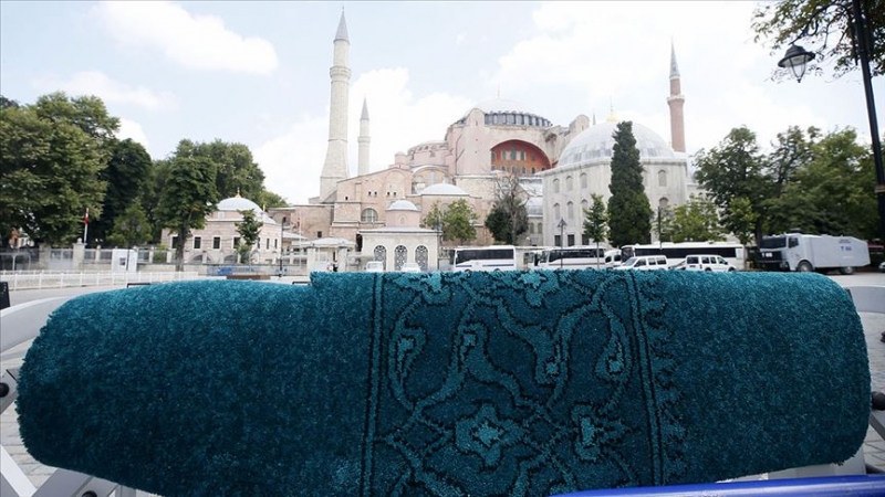 Ayasofya Camii cuma günü ibadete açılacak. Caminin en önemli unsurlarından halıların üretimi bir yandan sürerken bir yandan da serimi yapılıyor.