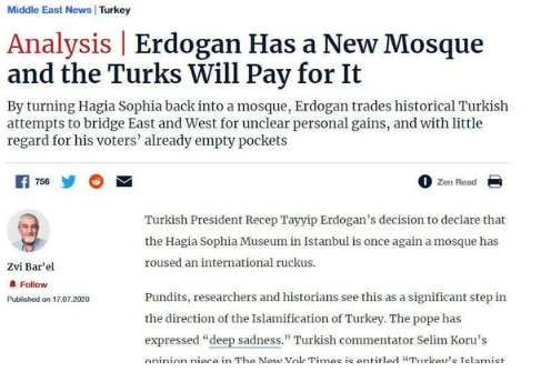 İsrail gazetesi Hareetz'de Zvi Brel tarafından kaleme alınan analizde Türkiye düşmanlığı gözler önüne serildi. Barel, Türkiye'ye karşı nefret kustuğu yazısında Türkiye'nin Ayasofya kararının bedelini ödeyeceğini iddia etti.