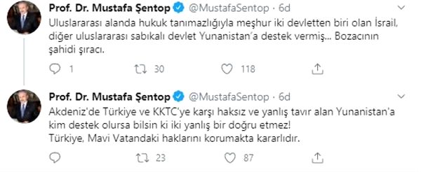 Şentop, Twitter hesabından yaptığı paylaşımda, "Uluslararası alanda hukuk tanımazlığıyla meşhur iki devletten biri olan İsrail diğer uluslararası sabıkalı devlet Yunanistan'a destek vermiş. Bozacının şahidi şıracı. Akdeniz'de Türkiye ve KKTC'ye karşı haksız ve yanlış tavır alan Yunanistan'a kim destek olursa bilsin ki iki yanlış bir doğru etmez. Türkiye, Mavi Vatandaki haklarını korumakta kararlıdır" ifadelerini kullandı